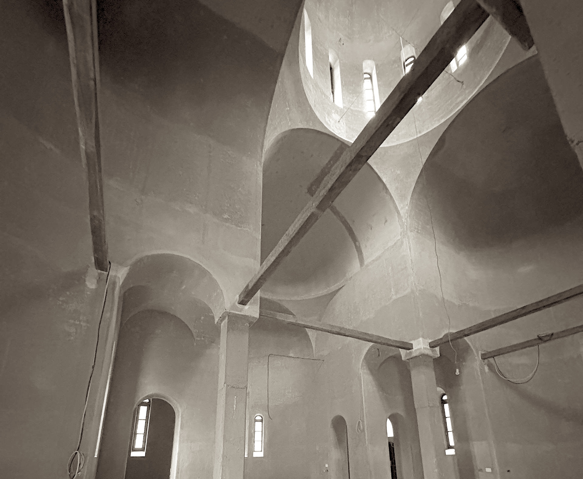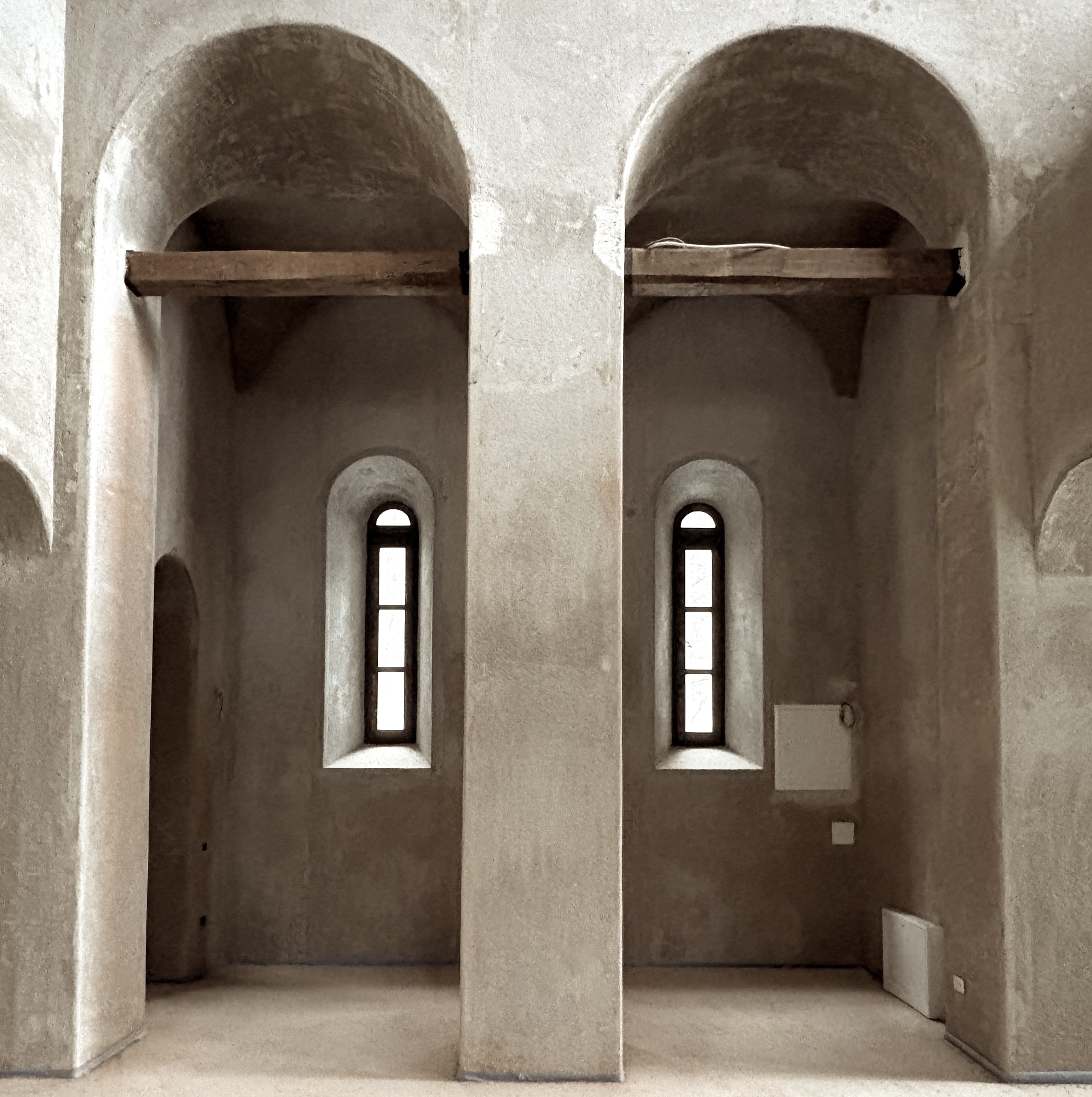 Eine Klosterkirche im Mitten des Waldes. Ein orthodoxer Raum in Form eines eingeschriebenen griechischen Kreuzes, entwickelt auf einem Quadratura-Grundriss, wie die Kirchen des Heiligen Berges am Übergang vom ersten zum zweiten Jahrtausend.